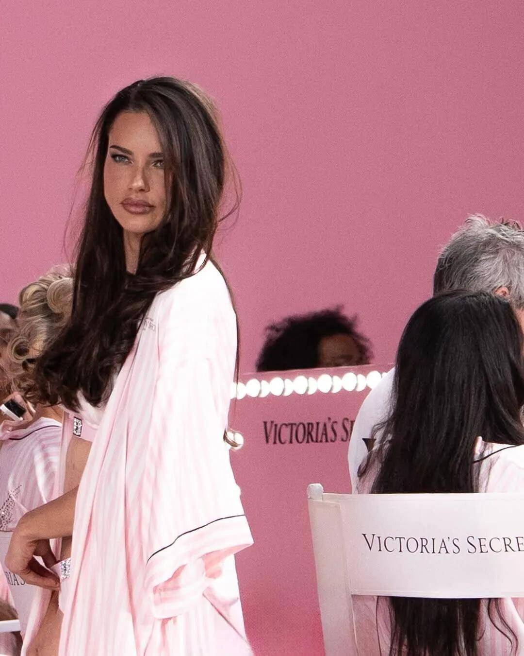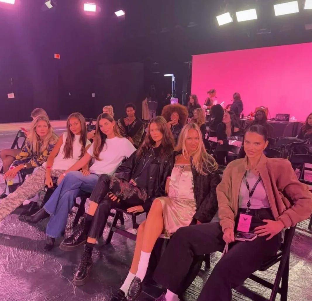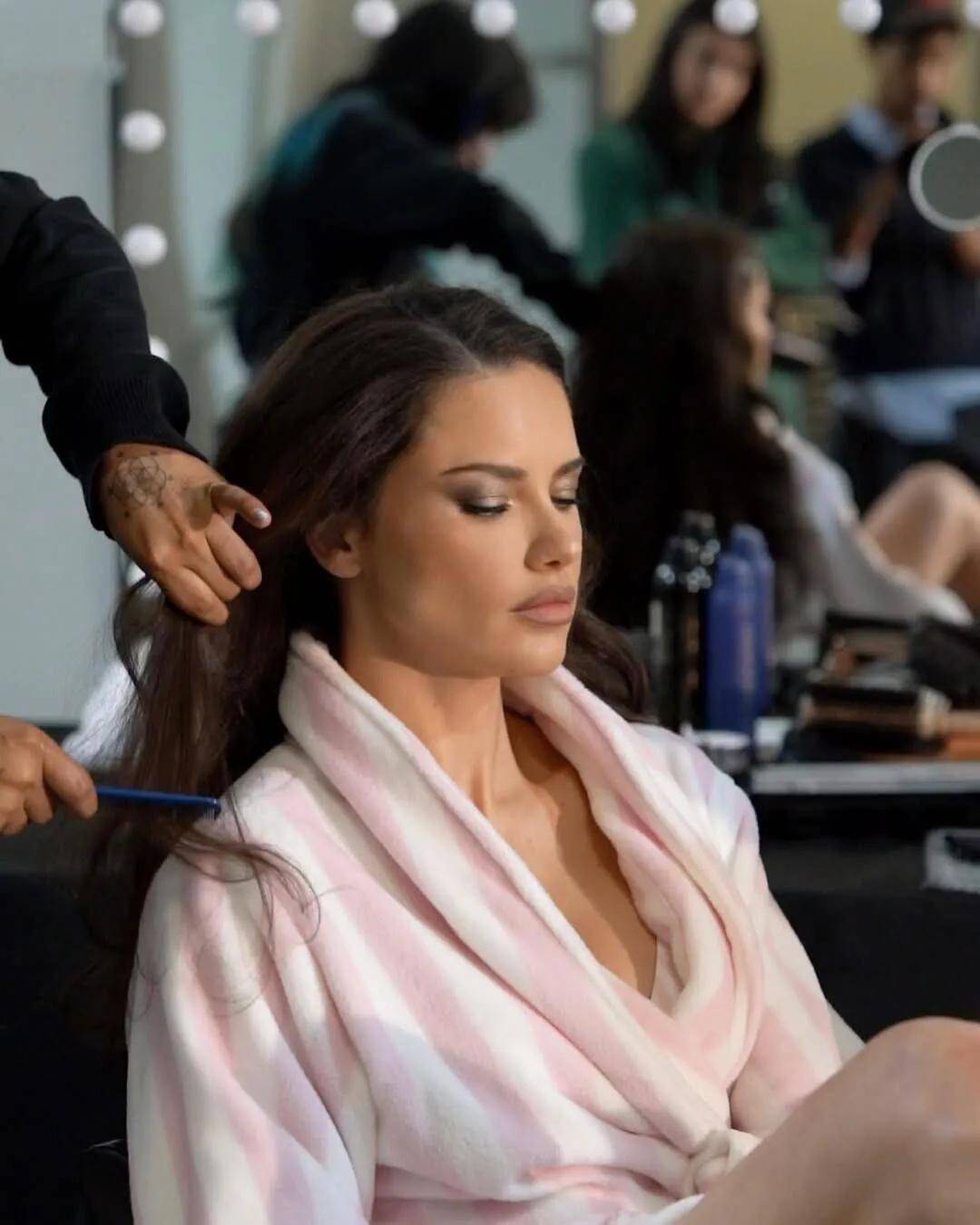 维密天使们已经在后台开始准备了 ,又是这套熟悉的粉色条纹维密睡衣,每一件衣服后面都用亮片点缀着天使翅膀。超模们已经开始在后台化妆了,华丽的大秀即将拉开帷幕。